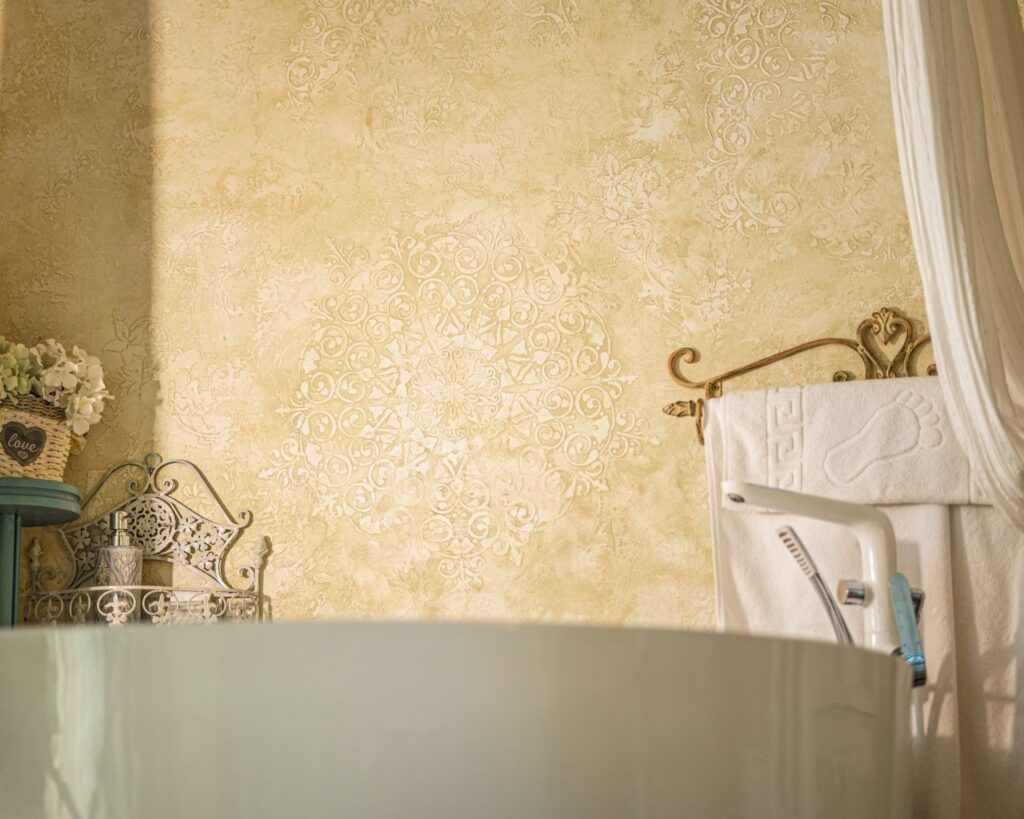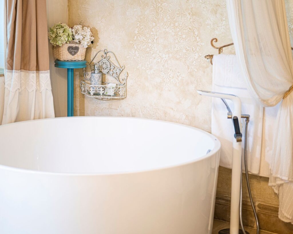 Bathroom: free standing bath in the room