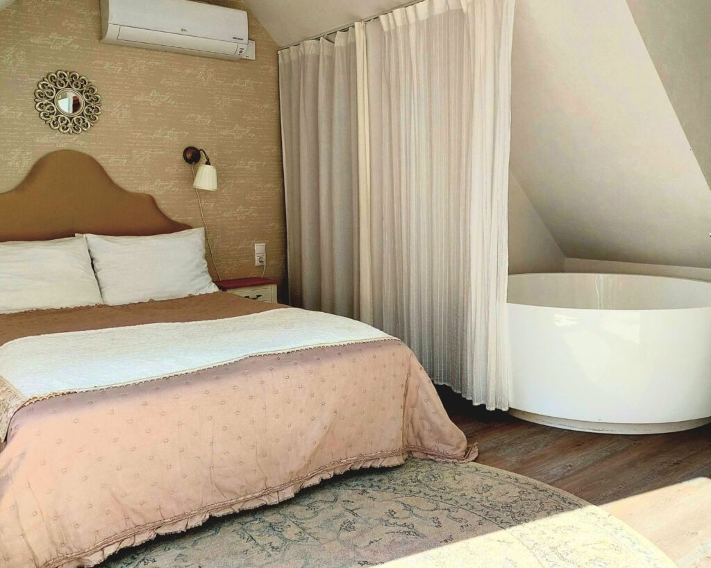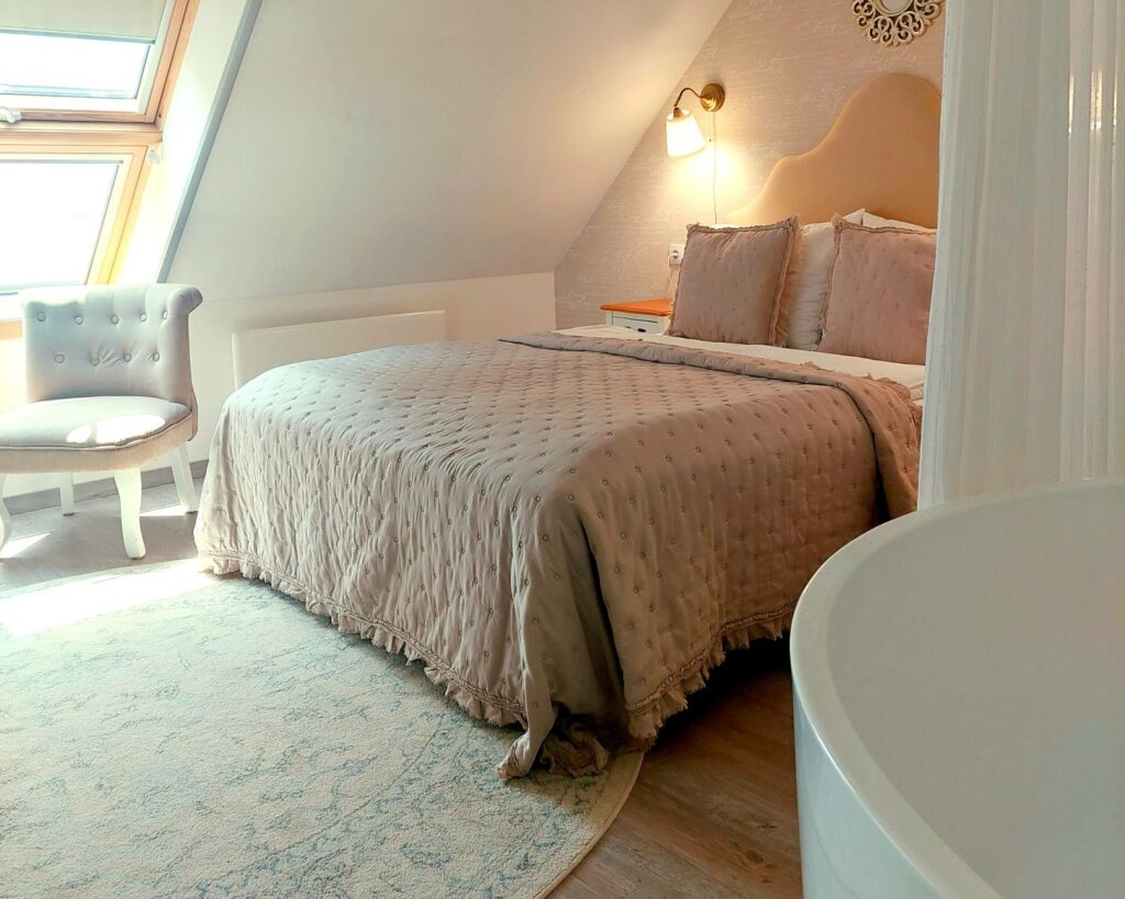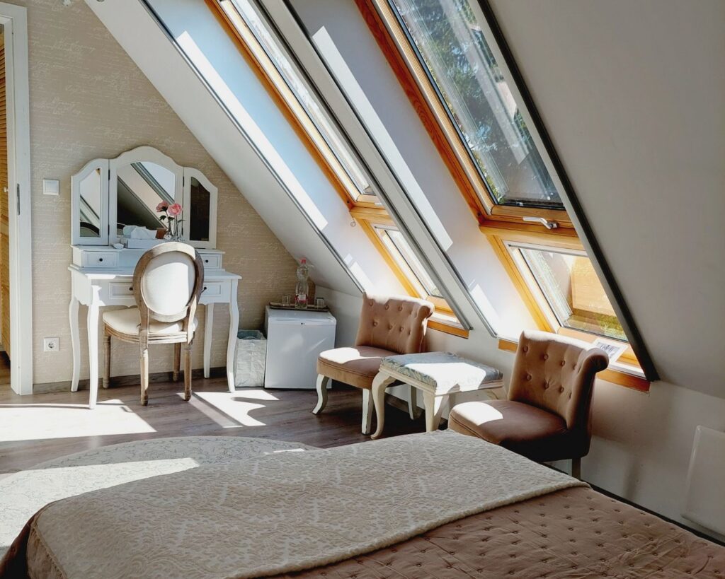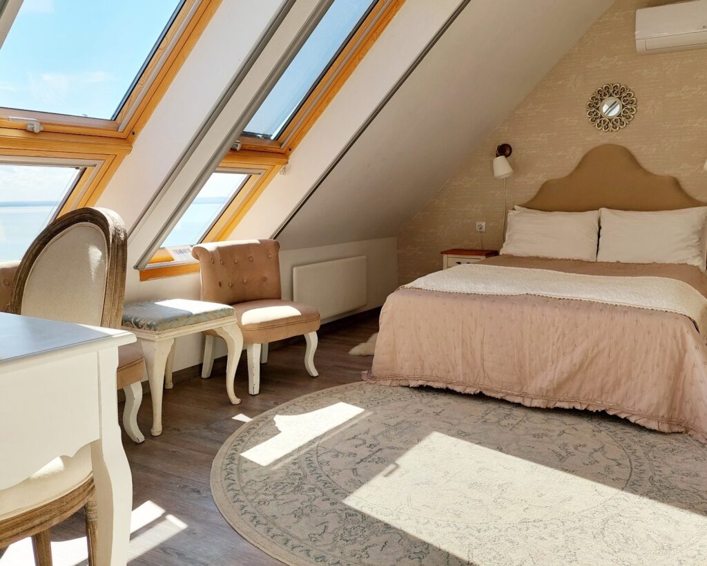 Kedves, romantikus hangulatú tetőtéri szoba klímával, óriási panorámaablakokkal, pazar kilátással a Balatonra, kertkapcsolattal,